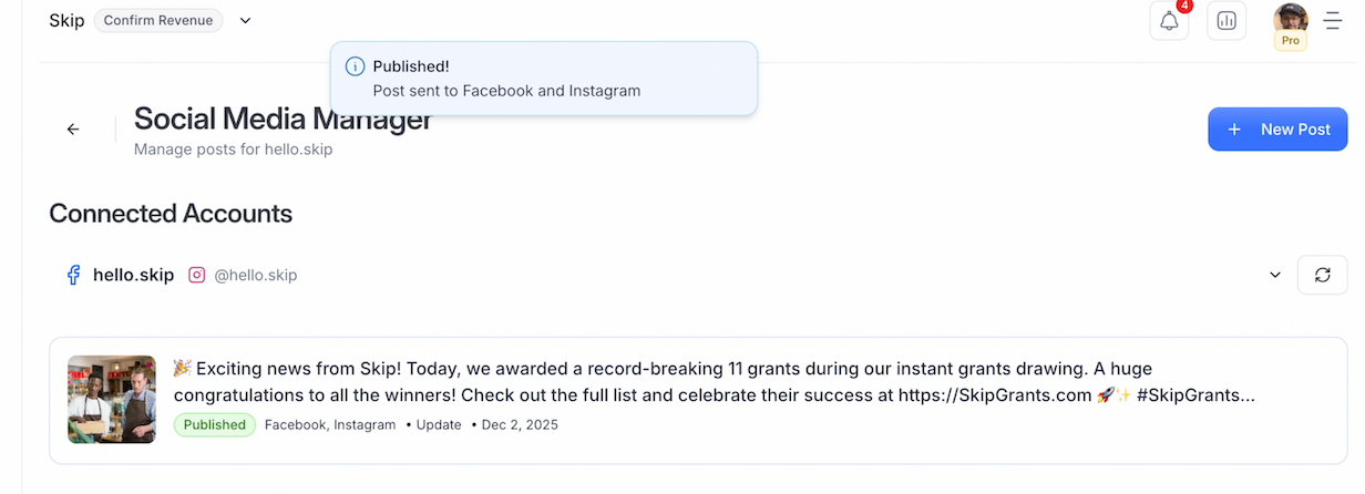 Skip’s newest AI tool makes it easier than ever to create, organize, and publish content across Instagram and Facebook. Entrepreneurs can now generate polished posts, refine captions, choose images, and manage their full posting workflow directly from the Skip dashboard. The Social Media Teammate is designed to help business owners show up consistently and professionally online without the time, stress, or guesswork that typically comes with social media.